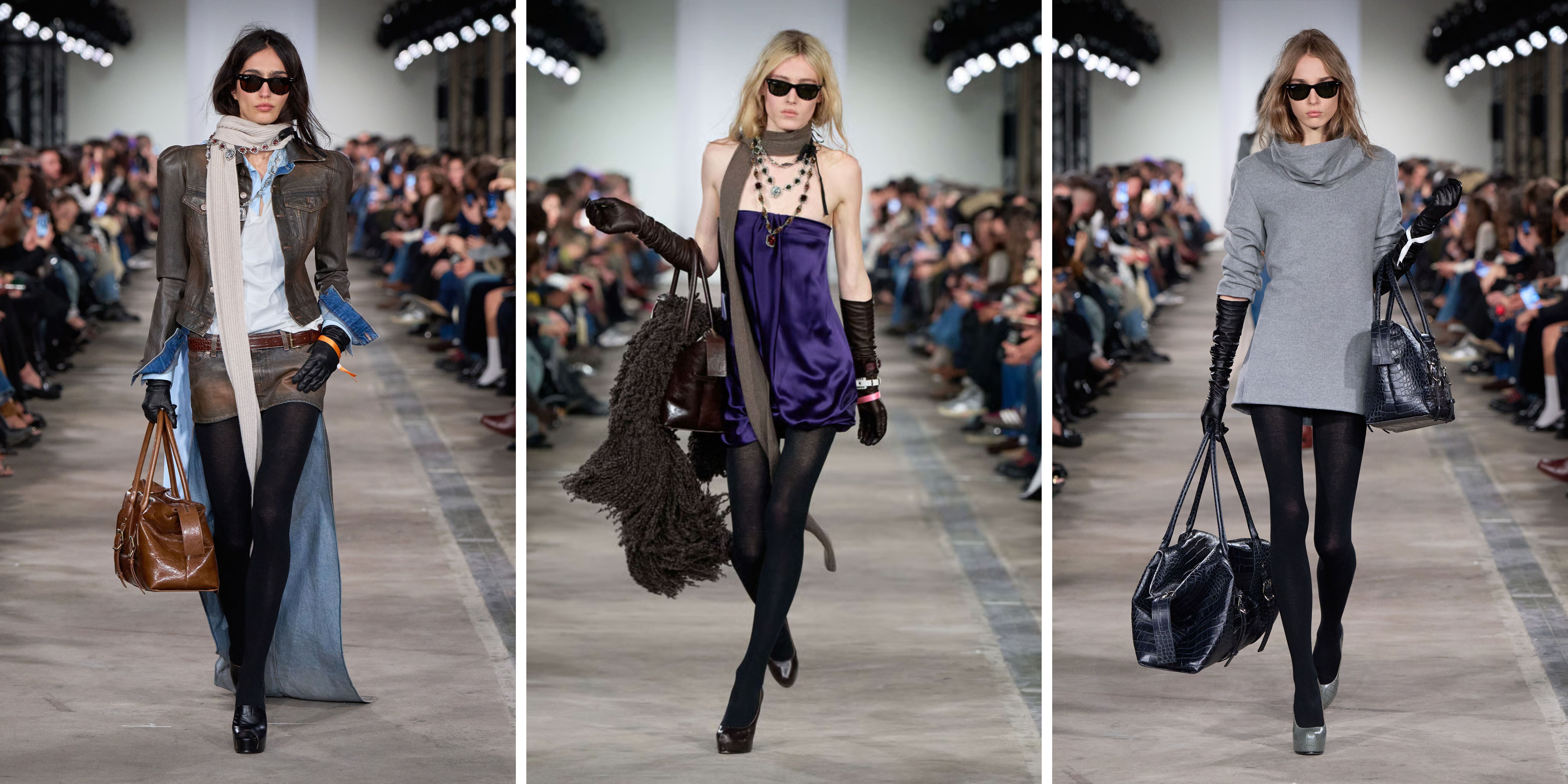 Denim blijft het kloppend hart van het huis en wordt krachtig herbevestigd met de terugkeer van de skinny. Non-stretch, uitgesproken skinny denim vormt het fundament van de collectie en wordt gedragen met intentie. Silhouetten spelen met contrasten: ultra-cropped tops tegenover floor-length bottoms, low-rise tailles en een bewuste clash tussen super-aansluitende en overdreven volumes. Zachte knitwear contrasteert met strak getailleerde jassen en mantels met uitgesproken, retro bombé-schouders. Er is geen middenweg — enkel spanning, proportie en impact.